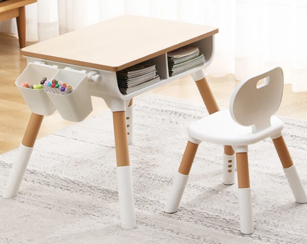 Bàn có thanh treo đồ bên hông, cho phép trẻ em treo cặp sách, balo hoặc các vật dụng cá nhân một cách gọn gàng và ngăn nắp.
